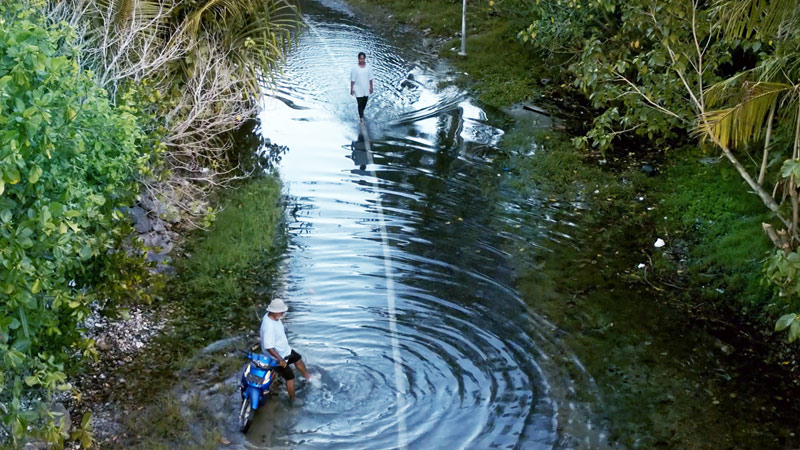 In a long sequence through Funafuti, one of Tuvalu archipelago’s islands (in the South Pacific Ocean) where the sea rises from the ground and floods it, the state of drought and flooding alternate fluidly, and without interruption.