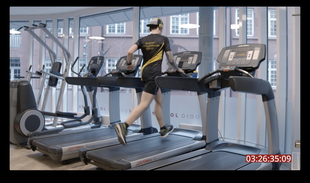 In 4_Runners (2021) by Mihály Stefanovicz, four ultrarunners on treadmills are staged in the gym or in private apartments throughout Norway. The static treadmill implies a post-modern theme where the use of soil - or running on the earth- is outdated. The runners move through space and time and different landscapes, with the treadmill wheel is perpetually turning without ever touching the ground, eliminating the notion