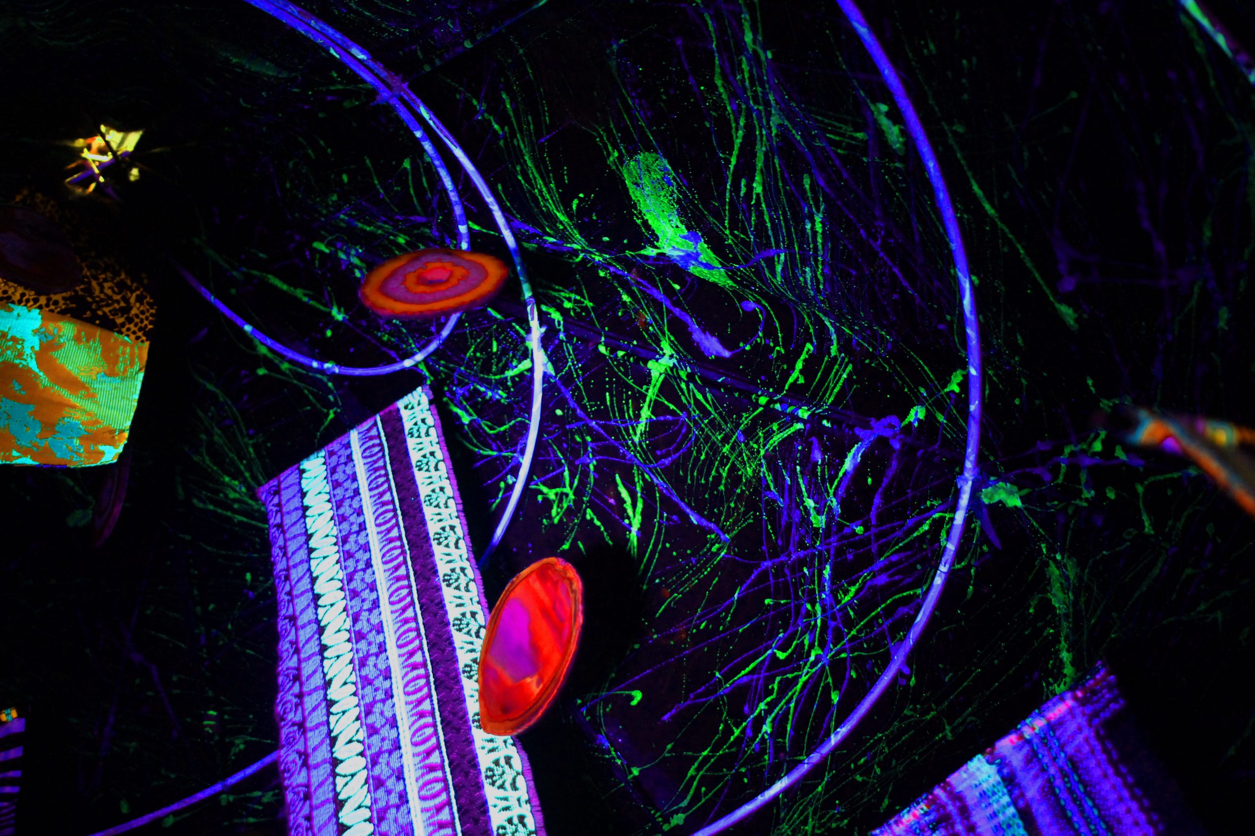 There are cameras that can capture invisible colours and display them to us as visible colours, but a more natural form of translation is the fluorescence of materials that absorb UV and emit visible light.