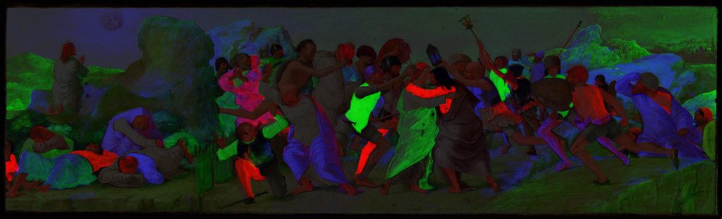The images also revealed pentimenti (underpaintings) and many other ‘lost’ details in the paintings. Another discovery, made by analysing a cross-section of a small painting sample, was a greyish toning layer covering much of the painting – with the notable exception of the figure of Christ – possibly applied during an early restoration. The natural ageing/yellowing of the varnish is one of the reasons the painting has become so dark.
