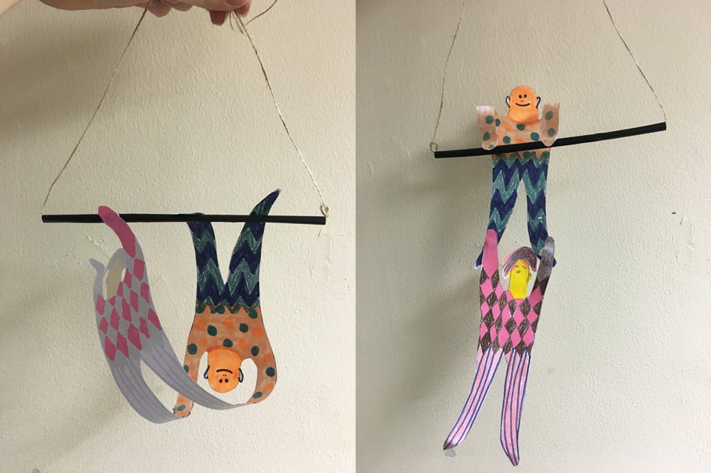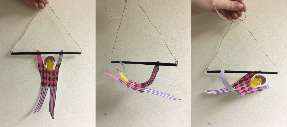 Now comes the splendour! Use the blue tack to stick your acrobat (or acrobats) to the trapeze. I would highly recommend searching trapeze artists videos for some dazzling inspiration.
