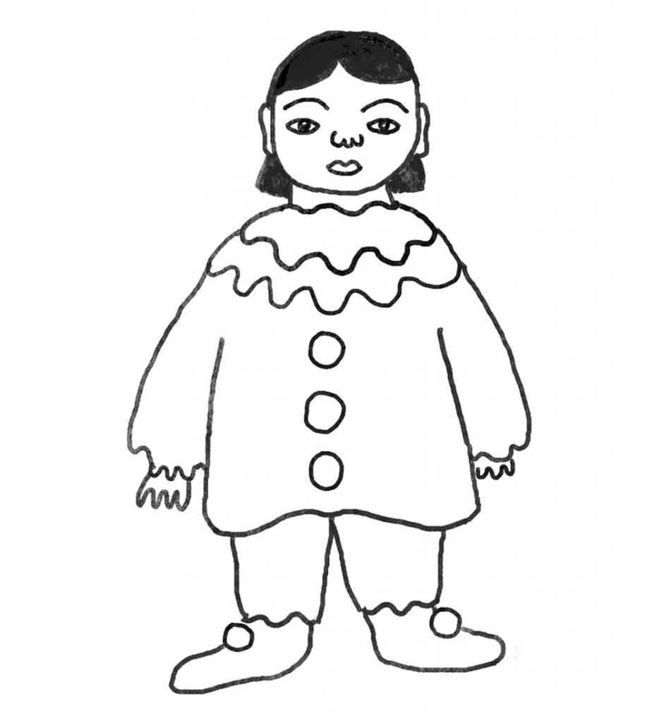 The two figures are based on the character of Pierrot the sad clown. Pierrot is a major character in pantomime theatre. He expresses meaning and his emotions through facial gestures and movements of his body, like mime. His face is painted completely in white and he often wears a white outfit.