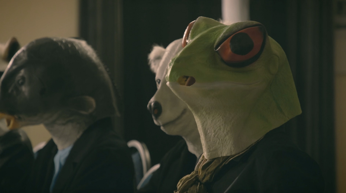 The fact that the viewer has no doubt as to who actually takes part in the proceedings amplifies the grotesque character of these scenes. People – who, every day, kill animals all over the world – are hiding behind the images of mammals, birds, and reptiles. The cheap, latex masks used in the film express the objectifying, colonial attitude of humans towards all other species inhabiting the planet. The film depicts the profound tragedy of animals – not only are their needs disrespected, but also – especially in the case of farm animals – their suffering is not understood or treated with empathy.