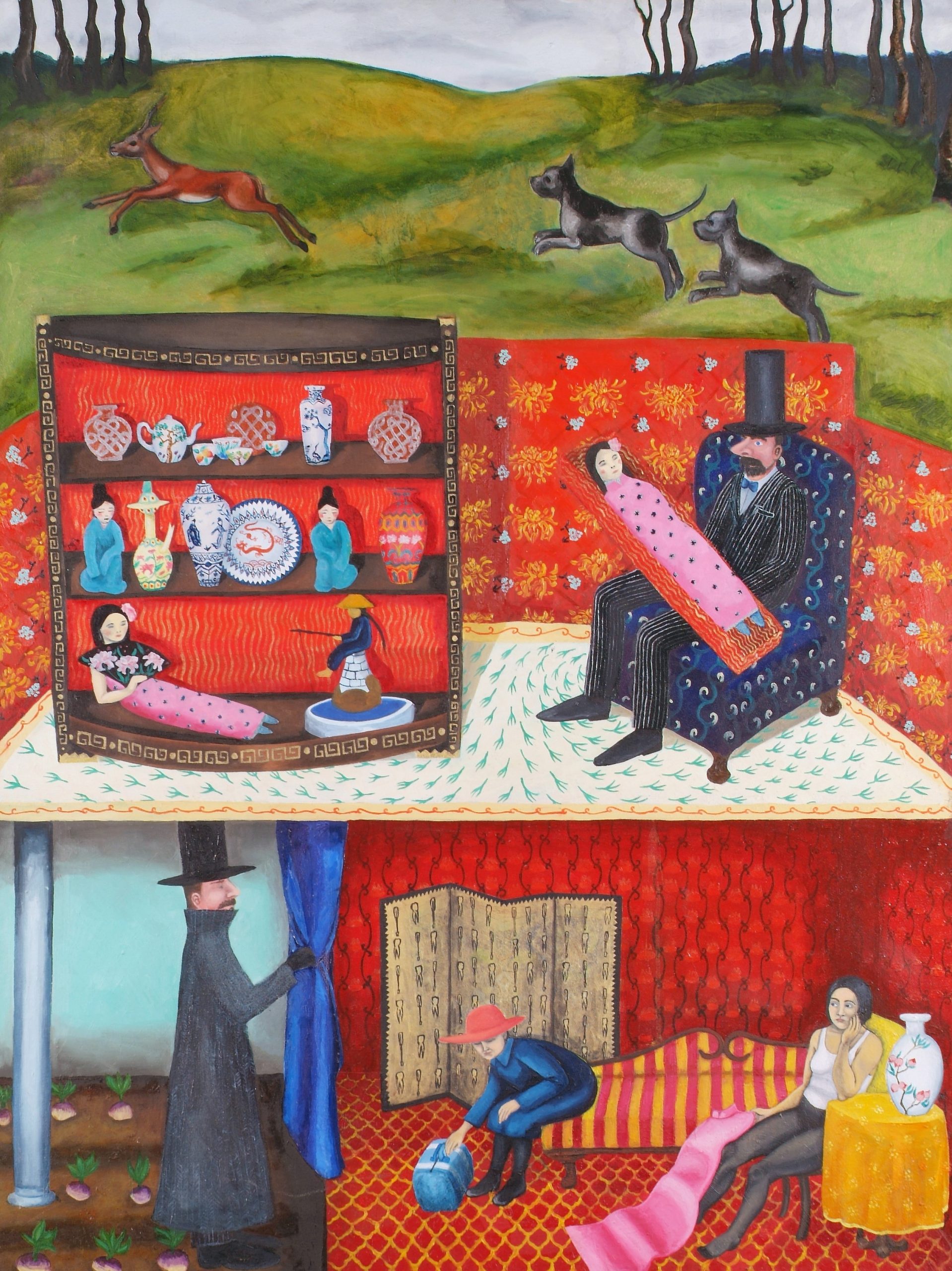 The painting also offers an unsettling mix of scenarios. While there is a repetition of the pink (perhaps restrictive) cheongsam dress in the upper storey, there is a sense of escape in the lower portion of the canvas. A sinister white male figure haunts both scenes, however; a threat which may be echoed by the hunting scene at the top. Adding to the mix, a screen at the centre of the lower part bears images of teeth and dental tools!