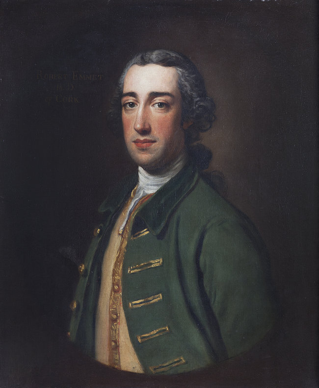 Robert Emmet (1729-1802), son of Rebecca Temple and Christopher Emett [sic] of County Tipperary, studied medicine at Montpelier University in France. Returning to Ireland, he practiced in Cork where he treated fever cases. It is he who changed the spelling of the family’s surname to Emmet.