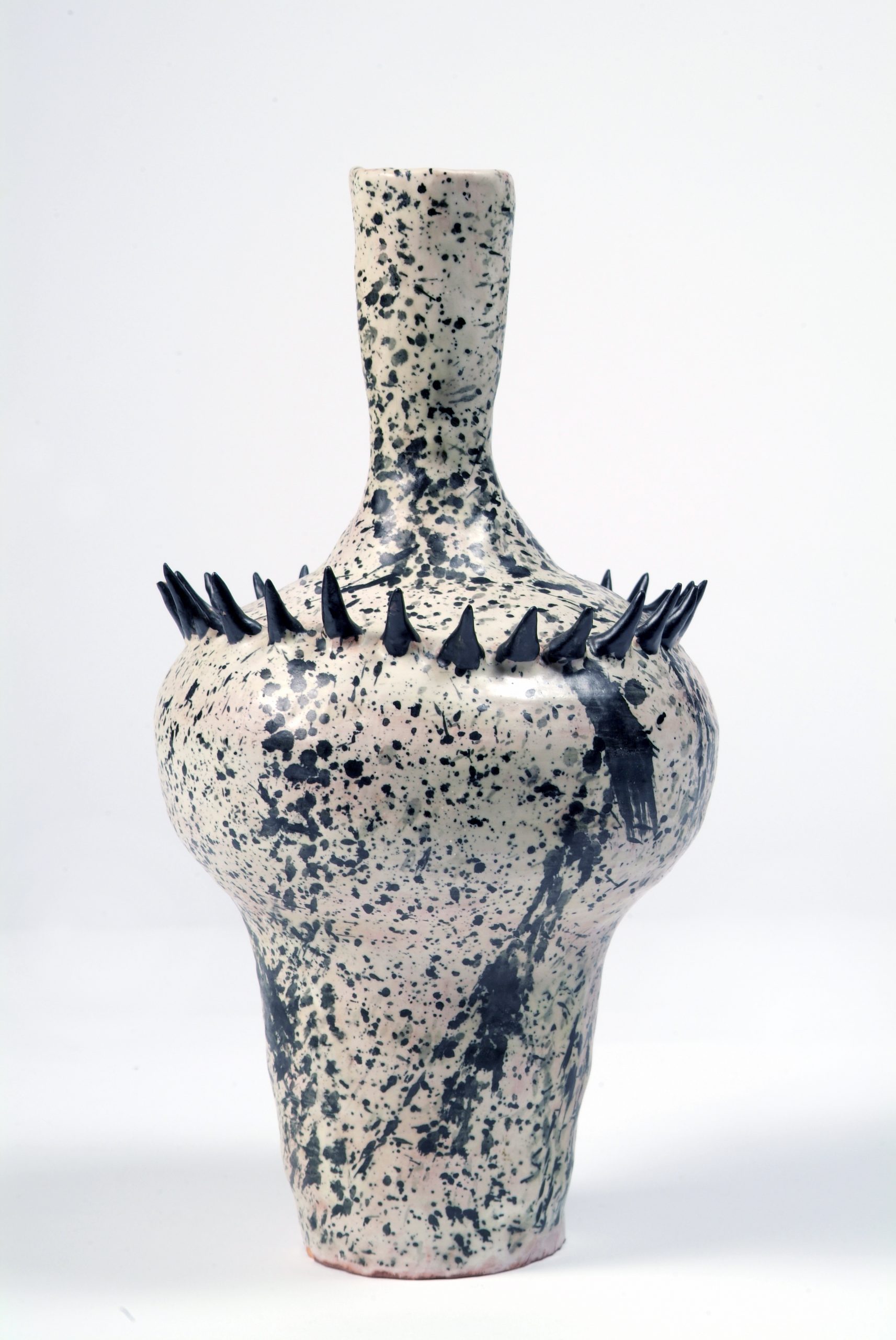 CAG.1334 John ffrench, Vase (green with black and grey speckled markings), 1960, ceramic, 28 x 6.5 cm. Presented, 1990. © the artist’s estate.