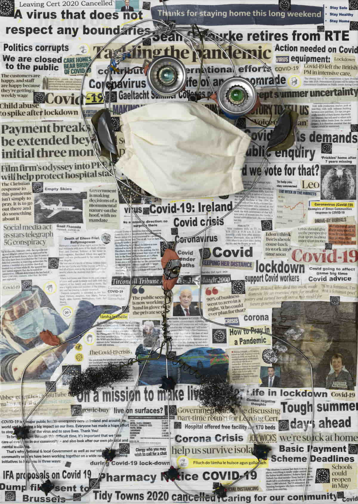 Scrap metal, solder, Newspaper clippings printed during the Covid 19 lockdown, PVA glue, marbles, voice recorder chip, fishing wire, mask, steel wool, clay, nail polish and glitter on canvas.